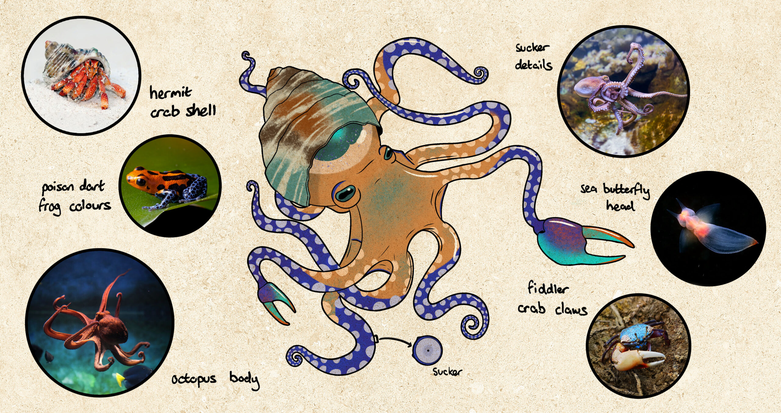 The creature was designed carefully to be able to protect itself against danger, and be able to effectively hunt by luring its prey. As well as its practically, it also has visual intrigue, with its bright colours and asymmetric aspects, such as its shell and uneven claws, inspired by the fiddler crab.
