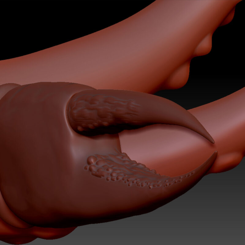 After retopologising in Blender, I worked in ZBrush to paint on details, such as the suckers on the underside of the tentacles, teeth on the claws and erosion on the shell. As well as this, I also added finer details, such as scratches on the shell and claws and veins on the body of the creature.To ensure that all of these details were clear, I worked between subdivision levels. Due to this models being heavily subdivided, I baked the details created in ZBrush on to the low poly mesh created in Blender to be textured.