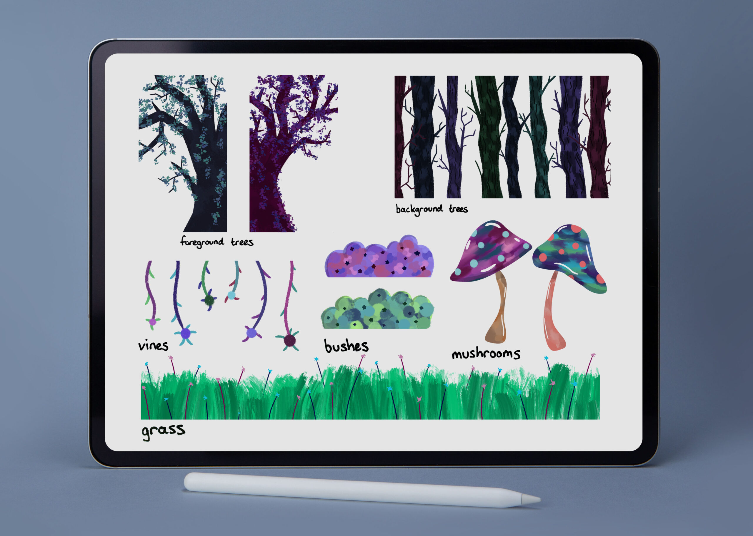 The 2D assets were drawn with in Procreate using a paintbrush style brush, to create a illustrative effect. For both the 2D and 3D assets, I used predominantly green, blue, purple and pink tones to create visual cohesion and to make the alien world look distinct from reality.
